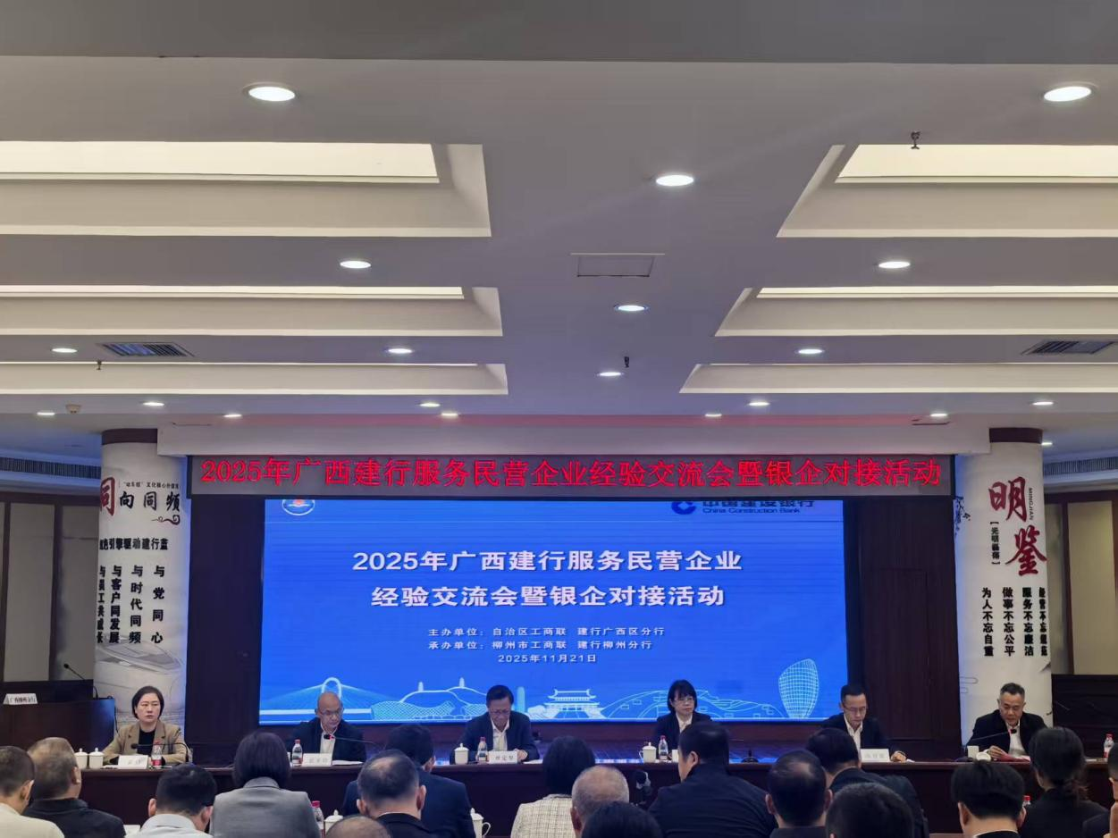 来源: 柳州市工商业联合会  | 发布日期: 2025-11-21 17:51  11月20日至21日,广西建行服务民营企业经验交流会暨银企对接活动在工业重镇柳州成功召开。会议由自治区工商联与建行广西区分行联合主办,柳州市工商联与建行柳州分行共同承办。自治区工商联党组成员、副主席覃定坚,柳州市政协副主席、市工商联主席莫玉和,市委统战部副部长、市工商联党组书记黄绮,建行广西区分行普惠部总经理邱喜康,建行柳州分行党委书记、行长郭劲军等领导出席会议。
